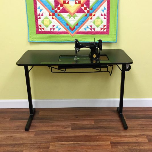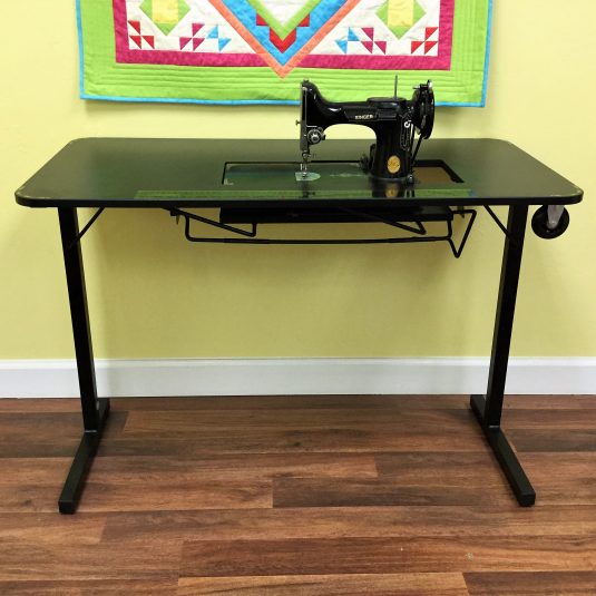 The Heavyweight Table is specially designed to fit your vintage Singer Featherweight! It’s beautiful black finish and gold decals will complement your 221K or 222K beautifully. It is a sturdy table with an opening that is specifically sized to fit your Featherweight, so it offers free arm and flatbed sewing without the need for an insert. And contrary to what the name implies, it’s completely portable, so it’s perfect for taking to classes and retreats, or packing in your RV.