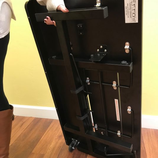 The steel locking legs offer a sturdy base, but fold up neatly for easy storage. It also has a Velcro strip to secure the legs in place and 2 wheels on the side of the table for easy maneuverability.