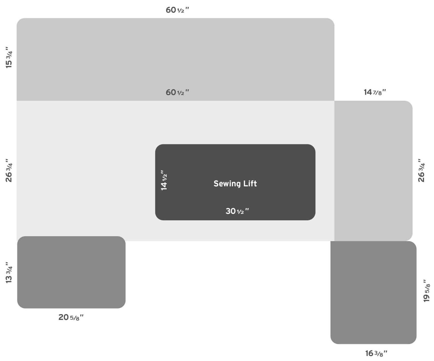 Looking for adaptability, innovative storage solutions, and miles of worksurface? Say G’day! to Sydney Electric Sewing Cabinet – our premier quilting and embroidery cabinet. With a rear quilt leaf, side leaf, tri-fold door with flip-up tabletop, pressing mat, drawer cover, embroidery spool holder, removable drawer tray insert, and innovative space for storing your embroidery arm, this cabinet can hold it all and do it all. We designed Sydney with the largest premium machines in mind – the extra-large lift opening and powerful dual rail electric lift accommodates the biggest premium machines on the market (up to 65 lbs). You can be sure that whatever project you’re working on, Sydney can handle it. Heavy duty locking casters move smoothly, locking drawers keep your tools and notions hidden safely away, and the included sewing well cover panel lets you maximize your usable work surface when your machine is tucked away inside the cabinet. This big, beautiful cabinet offers tons of work surface with both leaves and tabletop extended, and folds down to a 61 x 27-inch space when not in use.