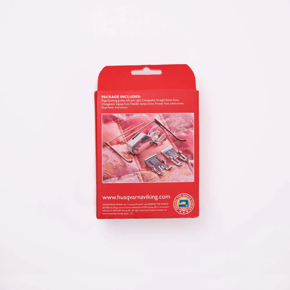 The Dual Feed Foot with changeable presser feet is designed to feed layers of fabric and/or batting evenly. It is perfect for quilting, sewing velvet, stretch fabrics, imitation leathers and fabrics need precise pattern matching.
