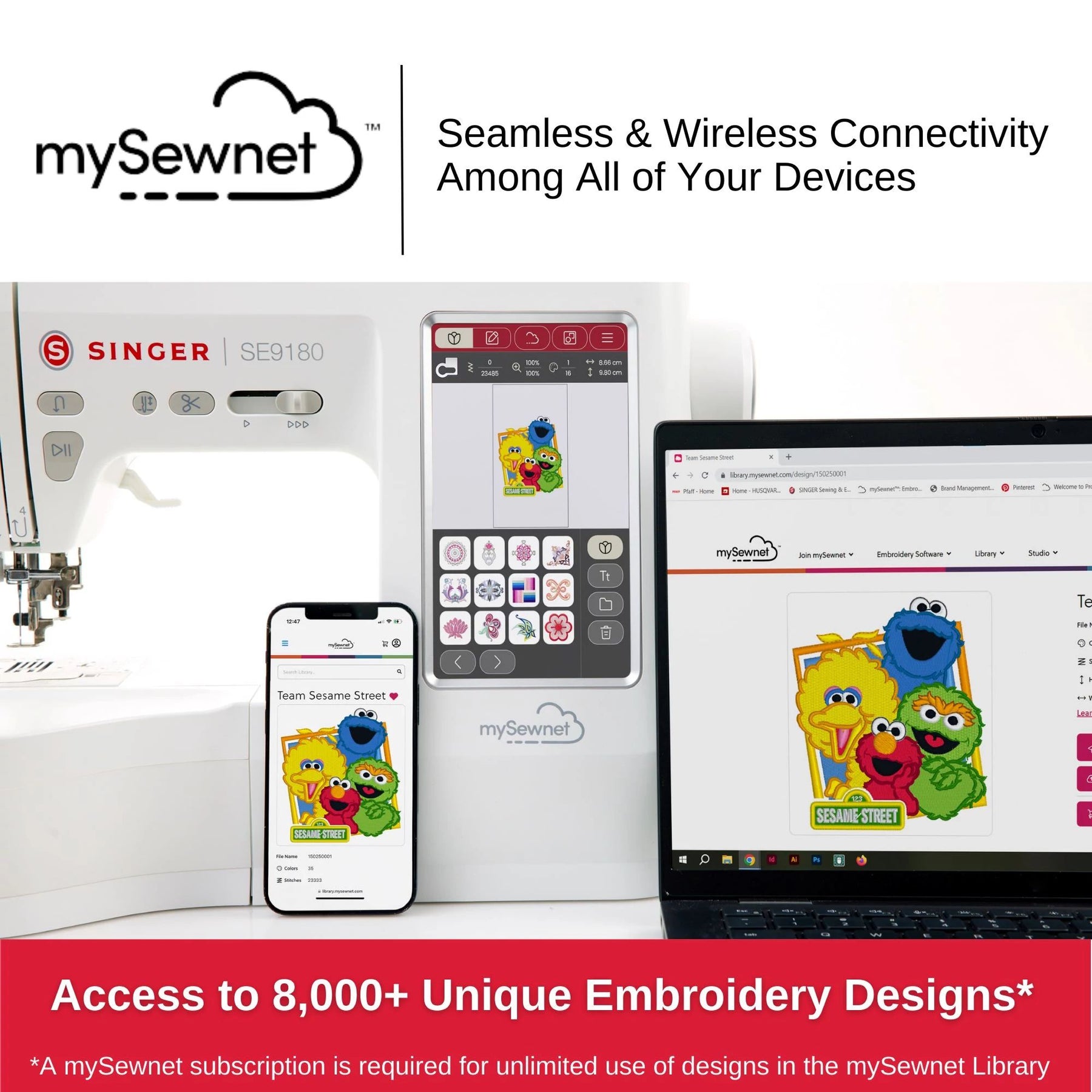 The SINGER® SE9180 sewing and embroidery machine is loaded with user-friendly features that sewists of all levels love like a large 7" touch screen so you can clearly see what you are stitching, and an automatic needle threader that will get you sewing in no time at all. Also, mySewnet™ connectivity gives you a whole world of possibilities from app notifications of your embroidery progress, to creating designs from scratch and so much more. Plus enjoy a 90-day free-trial of mySewnet software and the mySewnet Library, which has thousands of designs to choose from. With over 150 built-in embroidery designs and over 250 stitches, you get the best of both worlds with the Singer SE9180 sewing and embroidery machine.