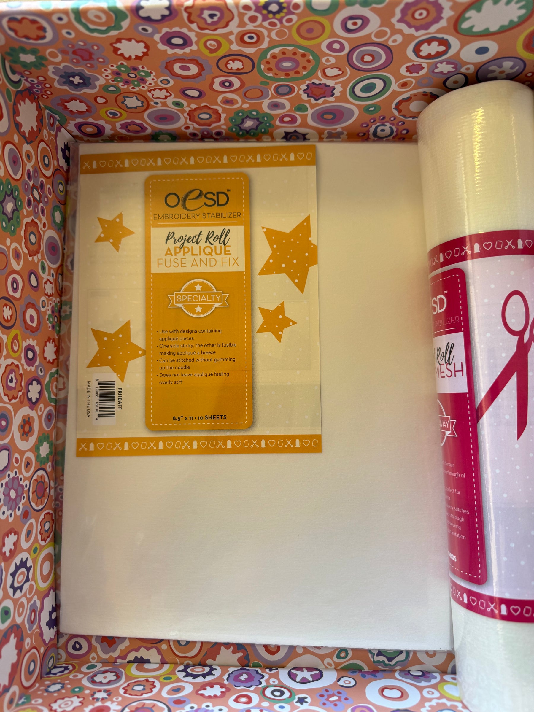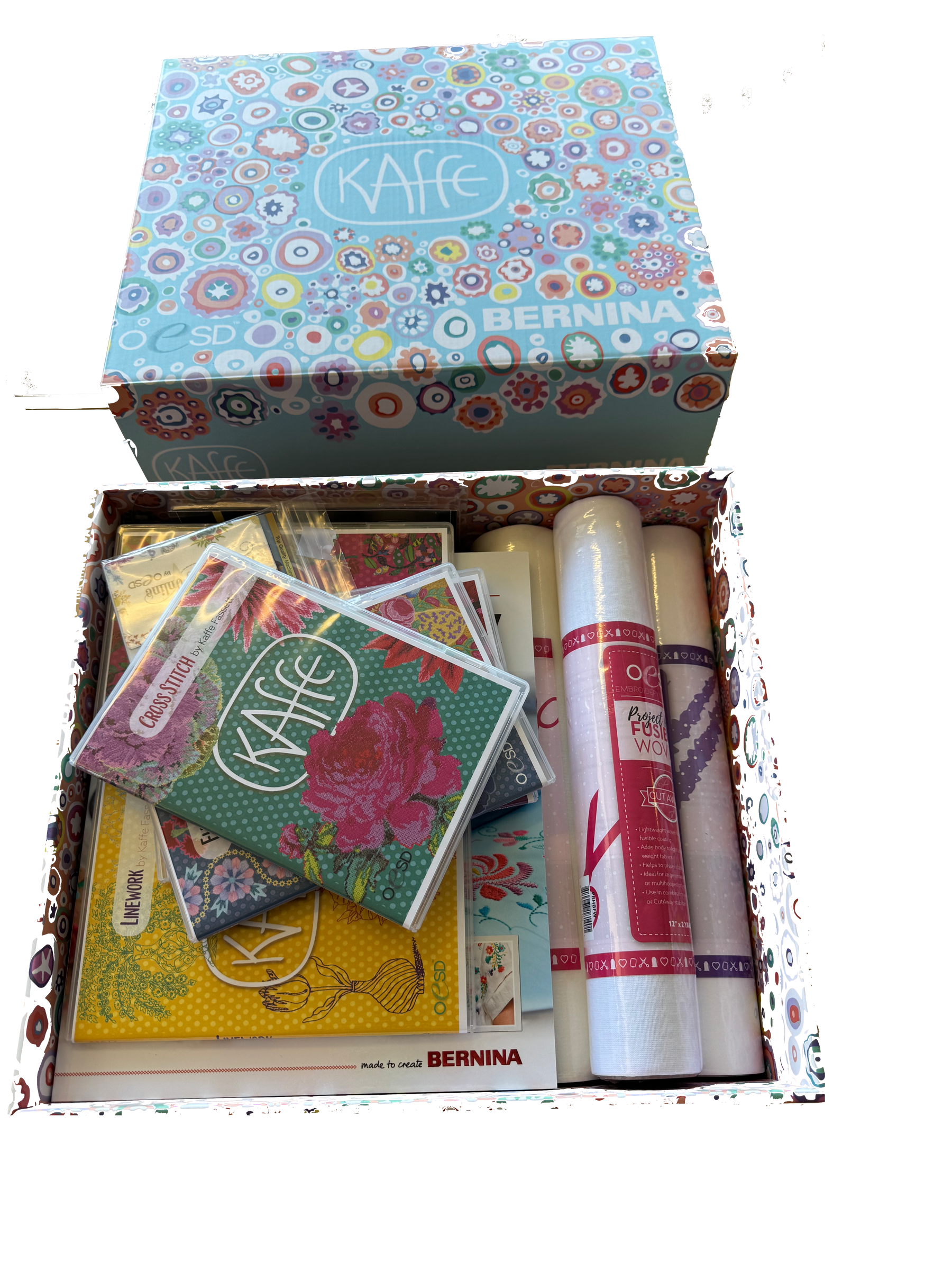 Bundle includes 5 special Kaffe embroidery design collections, Bernina Big Book of Embroidery along with embroidery needles. 12 spool of special Isacord embroidery thread, 3 rolls of stabilizer, and a pack of appliqué fuse and fix. 2 rolls of tear away tape. Everything is nicely fit in a limited edition Kaffe box.