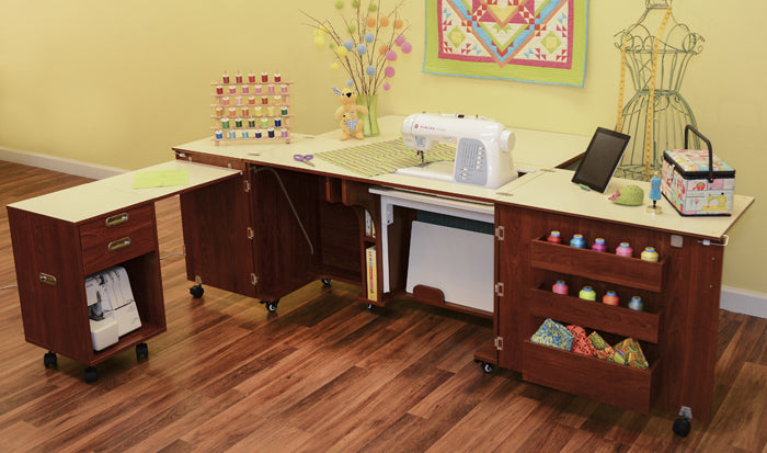 The quilt leaf extension on the back of the cabinet comes with your Aussie and helps to expand your work area, preventing large quilts from falling on the floor behind the cabinet.