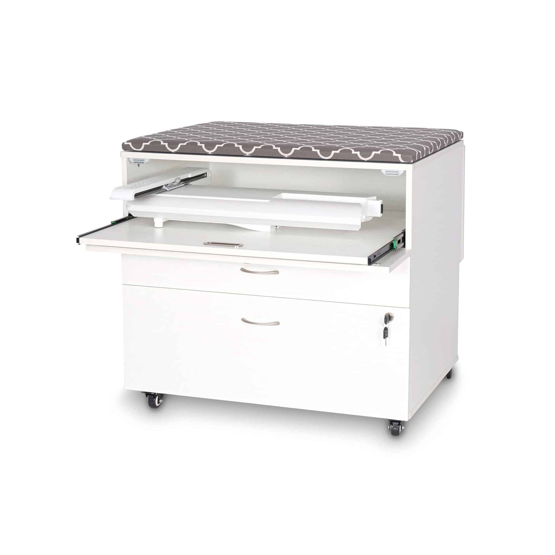 Keep your embroidery machine attachment safe, secure, and within an arm’s reach with MOD Embroidery Storage Arm Cabinet by Kangaroo Sewing Furniture! This upscale embroidery arm storage cabinet features full view, soft-closing drawer technology, complete with a magnetic hatch opening, 2 removable thread racks and a bottom double drawer for expansive sewing and crafting storage options! Beautiful hardware for smooth handling, and a convenient built-in pressing station to top it off!