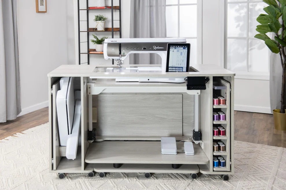 The Koala All-In One-Embroidery Studio is ideal for top-of-the-line sewing and embroidery machines. The Embroidery Studio packs Koala's bests design features into a studio for small spaces, distinctively designed for all of your project needs. Includes a glide-out Embroidery Modual and Thread Closet. Fully assembled, just add casters!