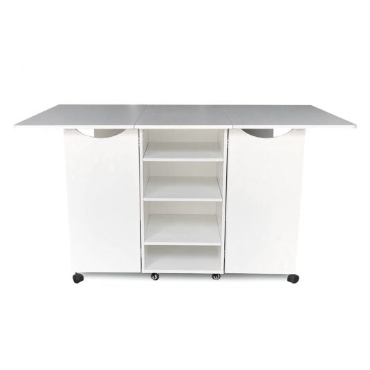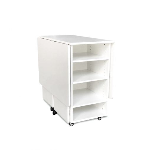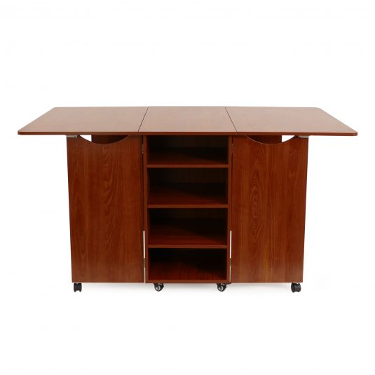 Kookaburra sits on 8 heavy-duty casters that provide stability, easy mobility and 360° access. Even better – Kookaburra’s 2 side leaves fold down to 20″ x 40″ to easily store when not in use! 4 storage drawers on the front, 4 storage shelves on the back, and 1 beautiful cutting table to help elevate your sewing and crafting experience!